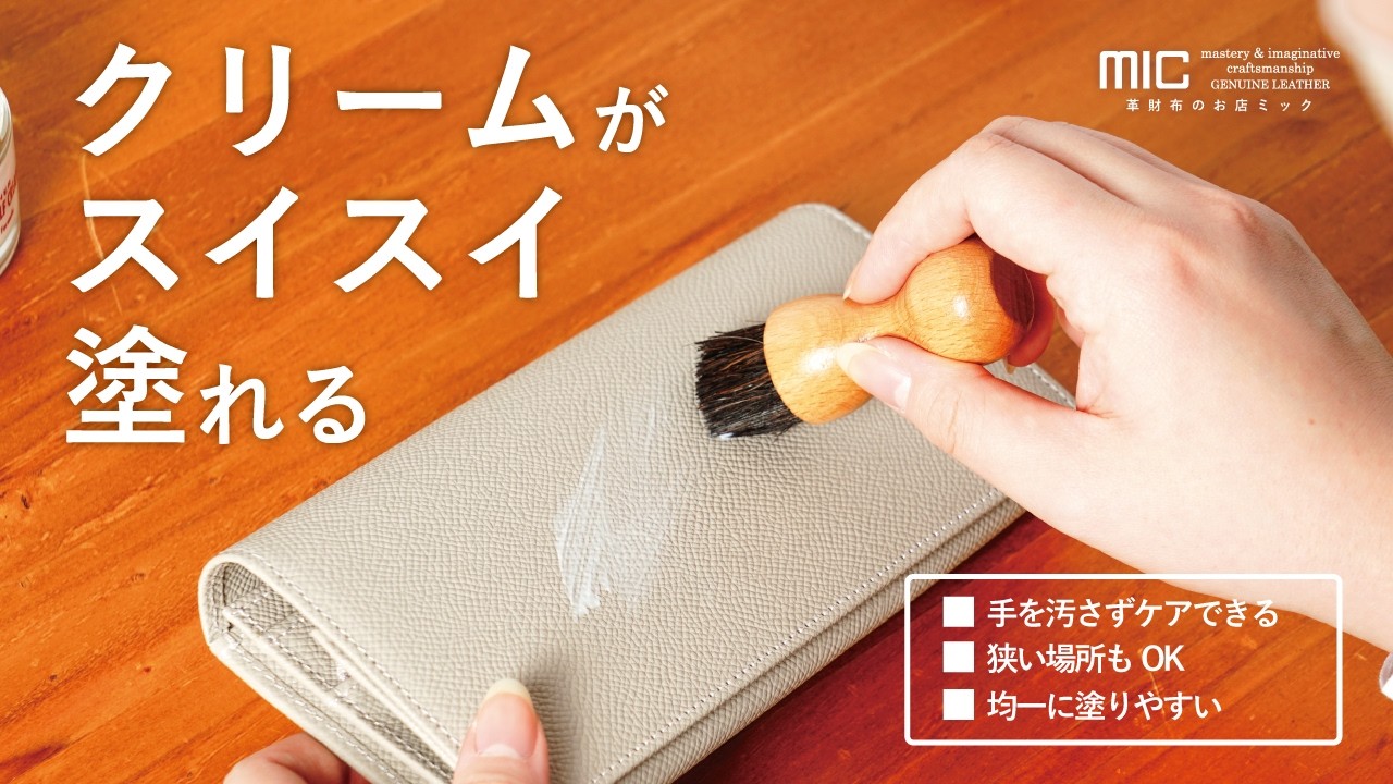 適度な毛の長さでコシのある豚毛のブラシは、財布の蛇腹状になったマチや、カードポケットの重なり部分など、革小物特有の入り組んだ場所にもスッと入り込み、奥までしっかりクリームを届けます。「隅々まで手入れが行き届いている」という安心感と満足感を与えてくれます。※コードバンなど傷が目立ちやすい革に使う場合は強くこすりつけないように注意してください。