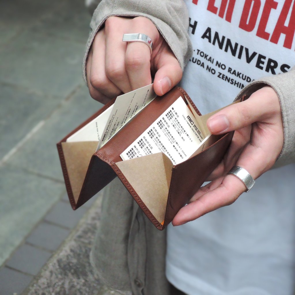 マチ部分の素材に和紙を使った名刺入れです。和紙のマチがポケットの仕切りになり、種類別に小分けにしやすく、またスムーズな出し入れを可能にしています。