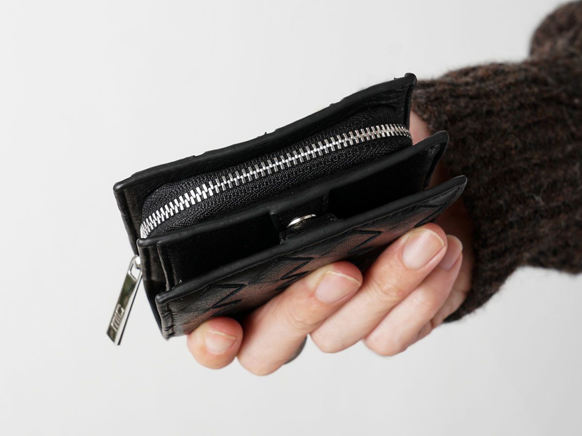 他の画像を見る ブラックメッシュ 二つ折りミニ財布 新商品 名入れ刻印可 販売価格 ¥ 12,100 税込 販売開始前です。 販売期間 2025/11/14 17:00 〜 大人の品格を引き立てる編み込みメッシュのデザインで、ほどよいサイズの二つ折り財布 詳細を見る お気に入りに登録する