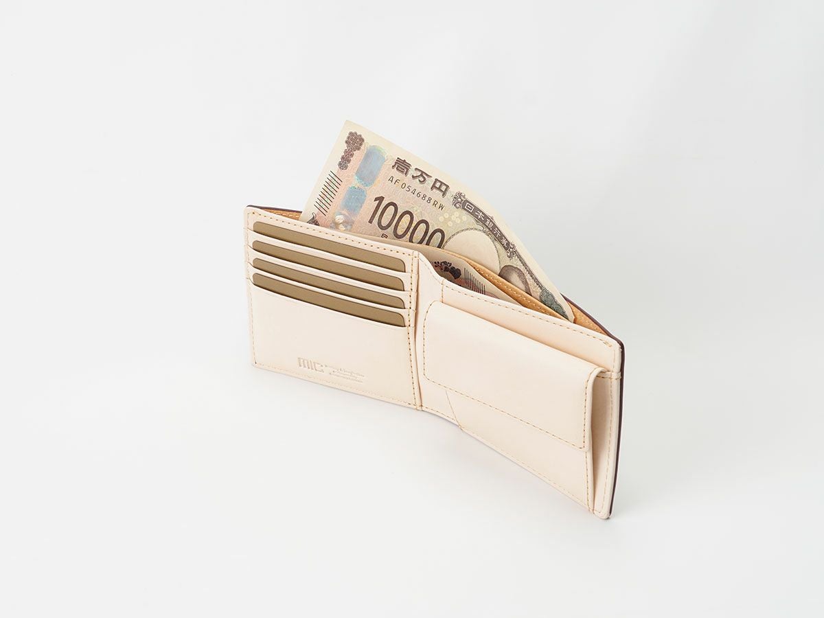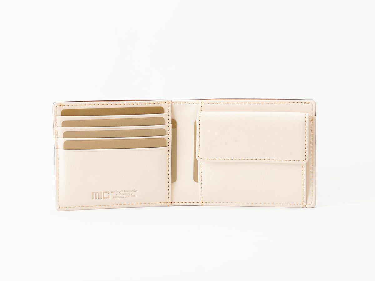 ポケットにすっきり収まる二つ折り財布は、日常の使いやすさを追求したデザインで、長く愛されている革財布の形の一つです。micでは外に小銭入れがついたタイプや、薄型でカード収納に特化したタイプなど、幅広いラインナップをご用意。使用する革も豊富で、使うほど風合いが深まるものや、柔らかく手になじむものなど素材にもこだわっています。名入れ刻印対応のアイテムが多く、ギフトアイテム選びにもピッタリです。