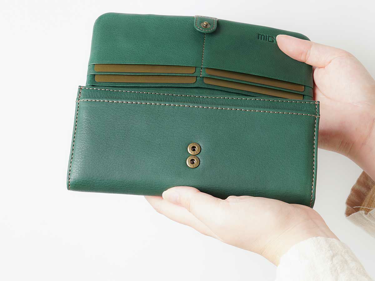 micさんの財布は、3つ目になりす。以前から気になっていたブライドルレザーの長財布、カラーに関して迷いましたが、使い込んだ時のイメージをしてグリーンにしました。サイズも片手で持ちやすく、しっかりとして気に入っています。表面の蝋が馴染んでくれるまで丁寧に手入れして大切に使いたいと思います。本当にオススメです。