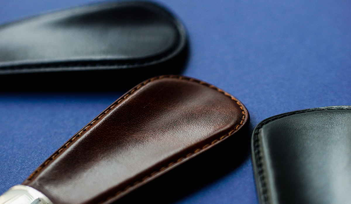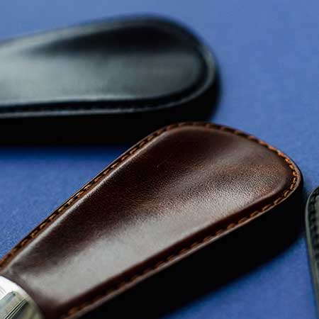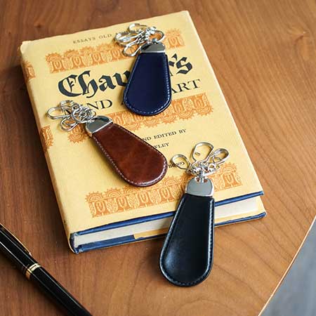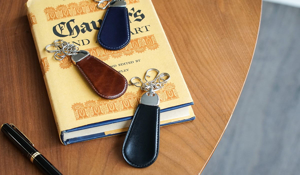 ヘッド部分に鍵を取り付けられるキーカンが付いた、手のひらサイズの靴ベラです。革が持つ温かみのある質感を持つ便利な革小物です。