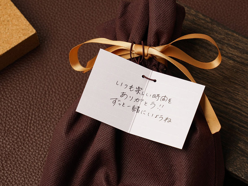 無料の不織布巾着、有料のギフトポーチどちらにもお付けいただくことができます。ご希望の方はスタッフにお申しつけくださいませ。