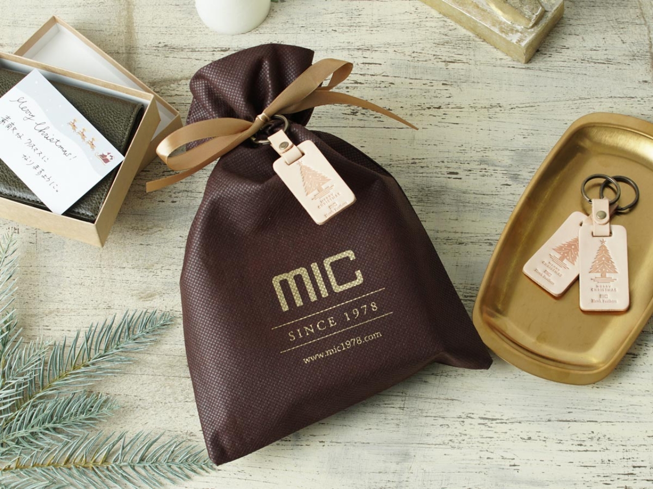 箔押しのロゴ入りの専用ギフトラッピングに、クリスマスだけの特別なヌメ革ギフトタグ※をお付けします。 ※無くなり次第終了となります。予告なく別デザインのタグに変更になる場合がございます。予めご了承のほど、よろしくお願いします。