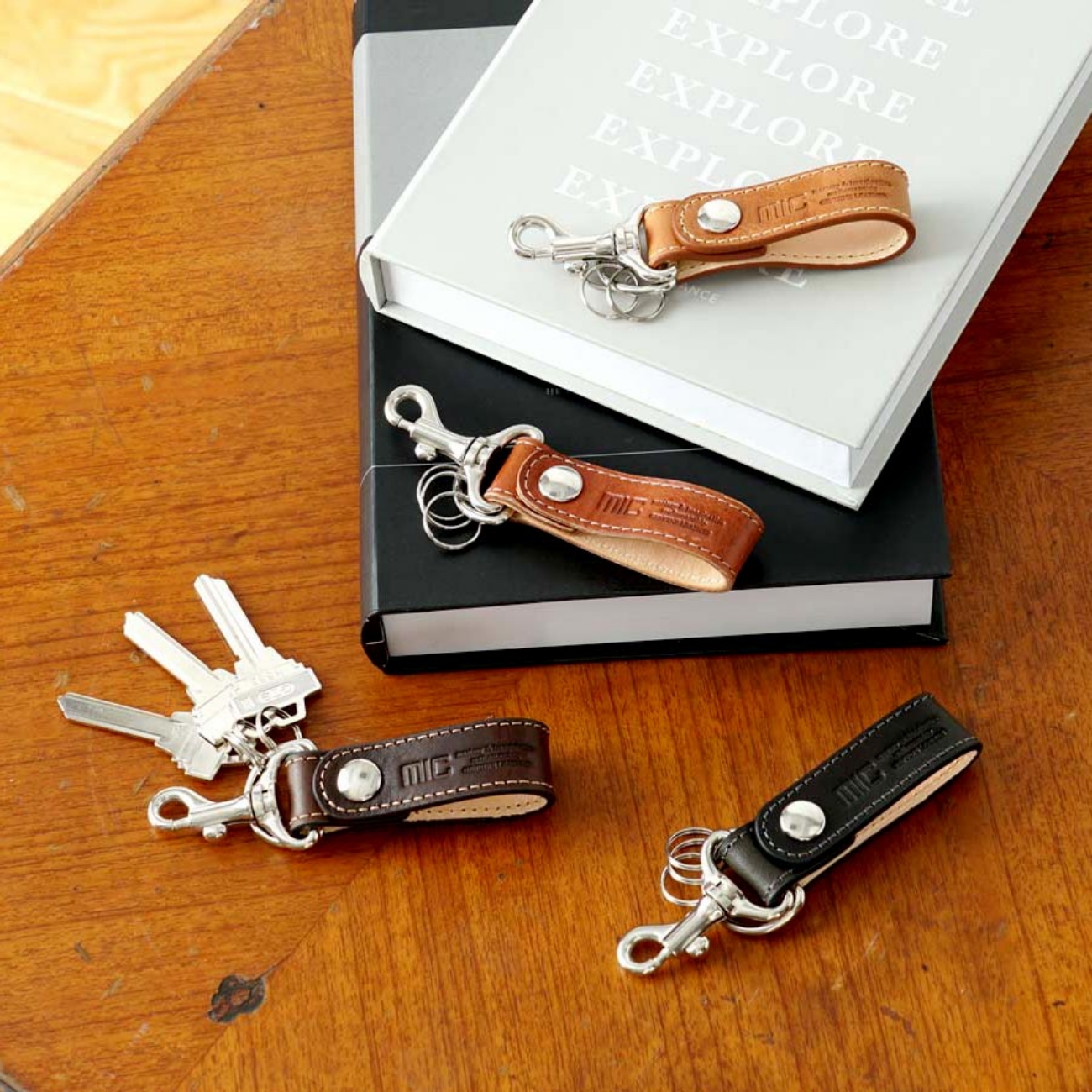 ヌメ、ブライドル、バグッダの3種類から選べるキーホルダーは、スナップボタン仕様でベルトやバッグに簡単に取り付けられ、ナスカンと3つの二重リングが複数の鍵やスマートキーに対応。ナスカンが異なる2タイプありますが、「鉄砲ナスカンタイプ」ヒップポケット革財布と組み合わせて使うことができます。