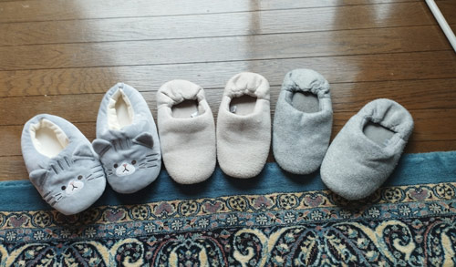 右から一昨年のスリッパ、昨年のスリッパ、「僕も履きたい」とリクエストを受けてお返しに贈った息子のスリッパ。一昨年のスリッパはヘビーユースが過ぎて、もこもこではなく「くたくた」(笑)。