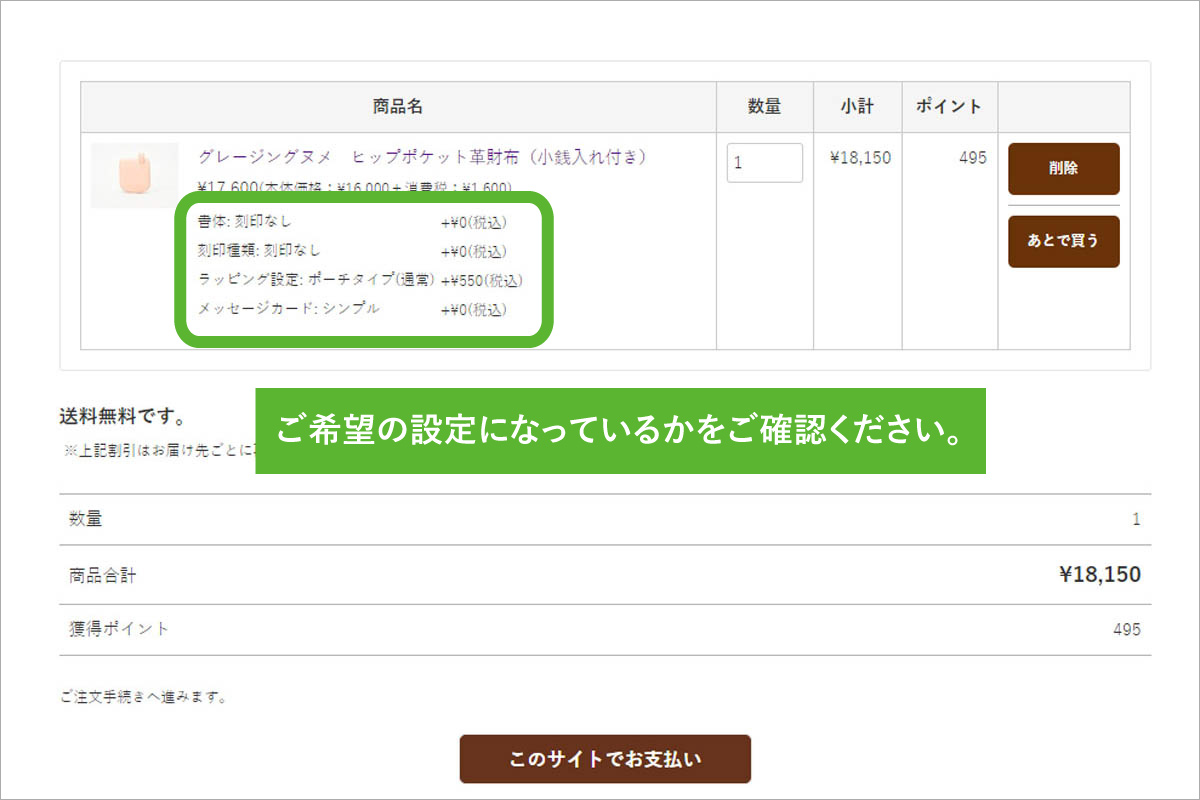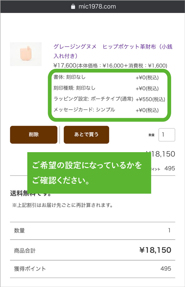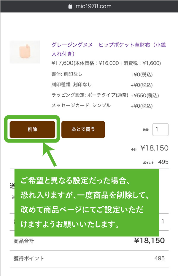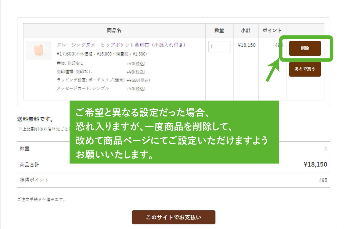 3.もし内容に誤りがある場合は、一度商品を削除して、商品詳細ページより再度正しいオプションを選択し、カートへ投入して下さい。