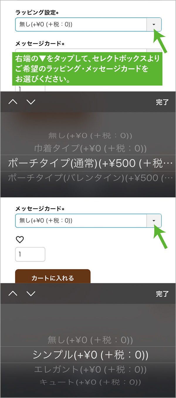 「ラッピング」「メッセージカード」のセレクトボックスより選択して下さい。