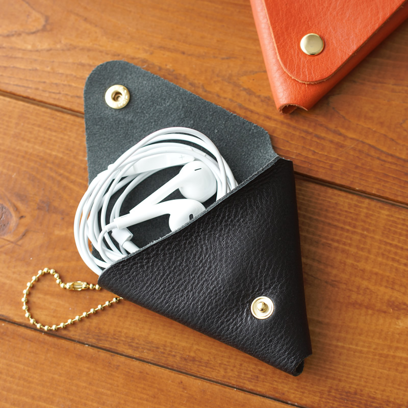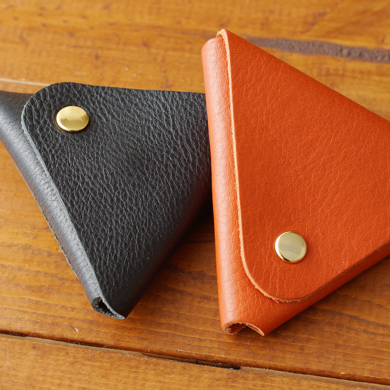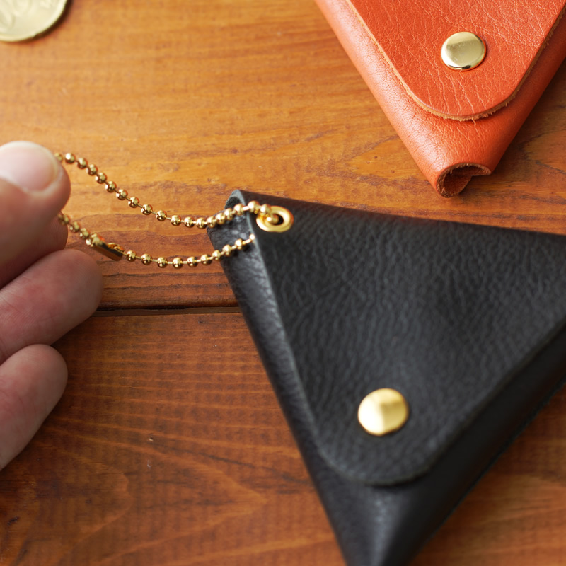 ボタンで止めるタイプの三角形のコインケースです。ブレターニャヴァケッタシリーズの革を使用し、エイジングも楽しめます。ボールチェーンも付いていますので、バッグ、ベルトループなどにぶら下げてお持ちいただけます。小さめのイヤホンなども収納可能です。色はブラック・オレンジのいずれかをお選びいただけます。