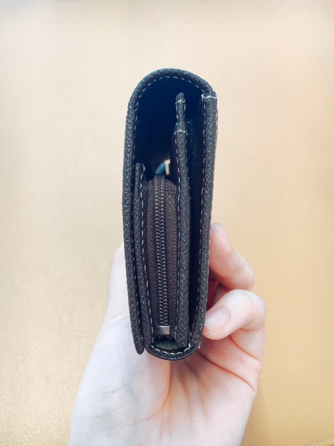 横から見ると小銭入れが段違いで付いているのがよくわかりますね。