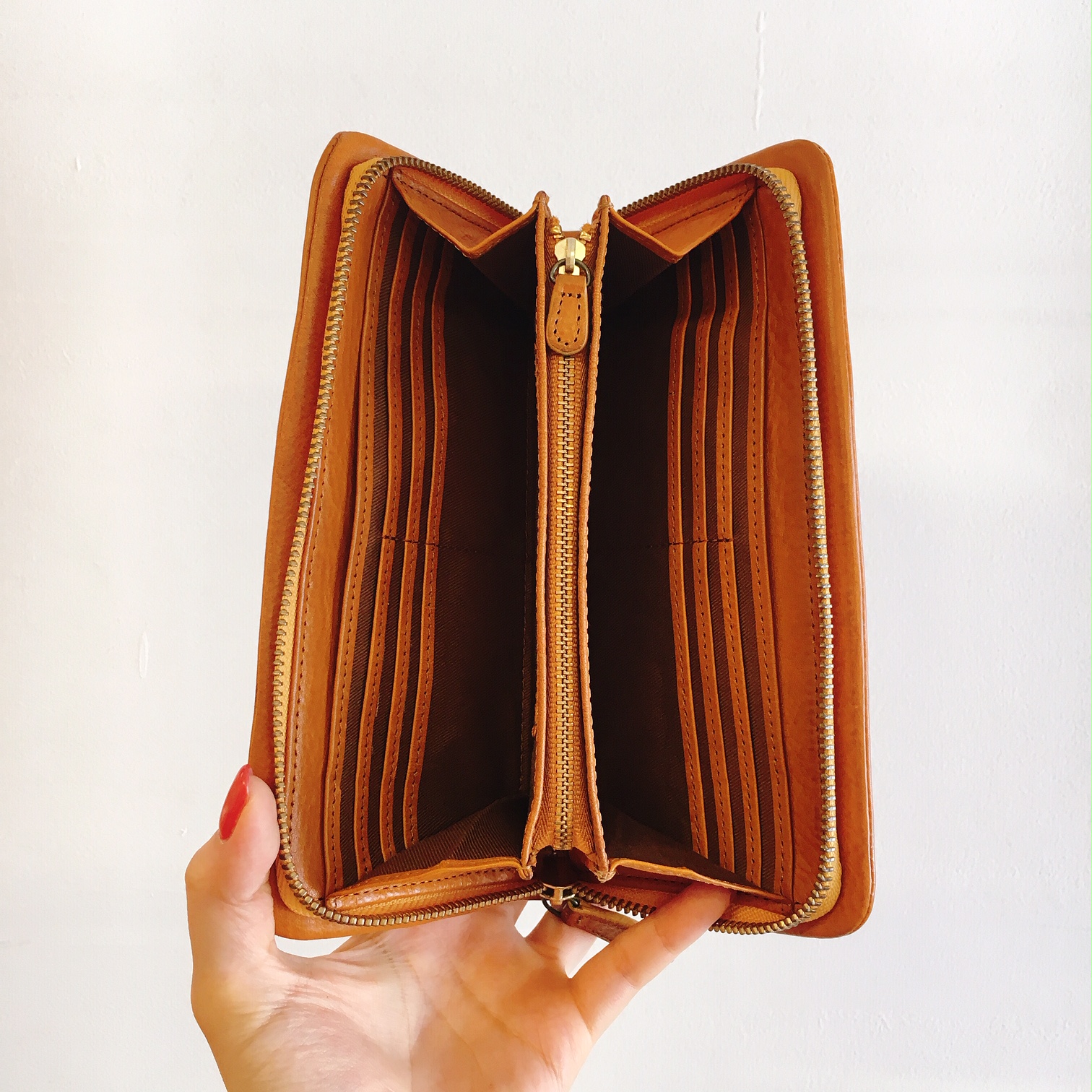 袋縫い(内側を縫い込んだ後に裏返し、表にミシン目が出ない製法)を用いており、ふわっとした質感を楽しめるお財布です。