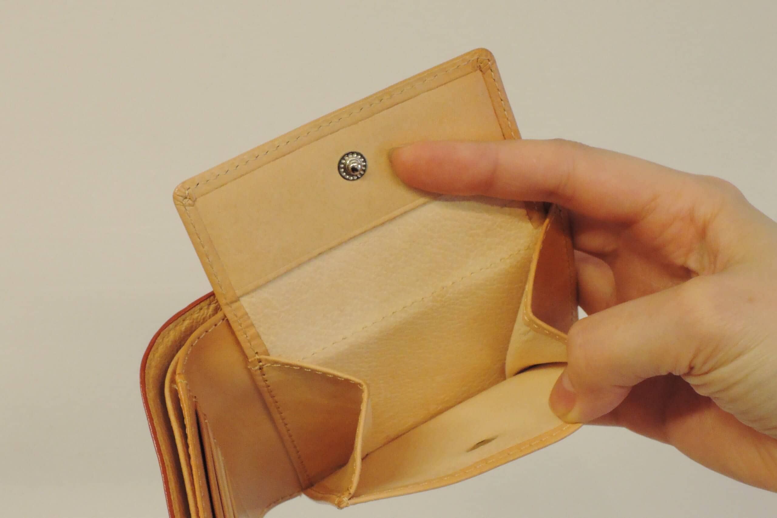 中はベージュの豚革を使用しており、薄いですが摩擦に強いので長くご使用いただけます。