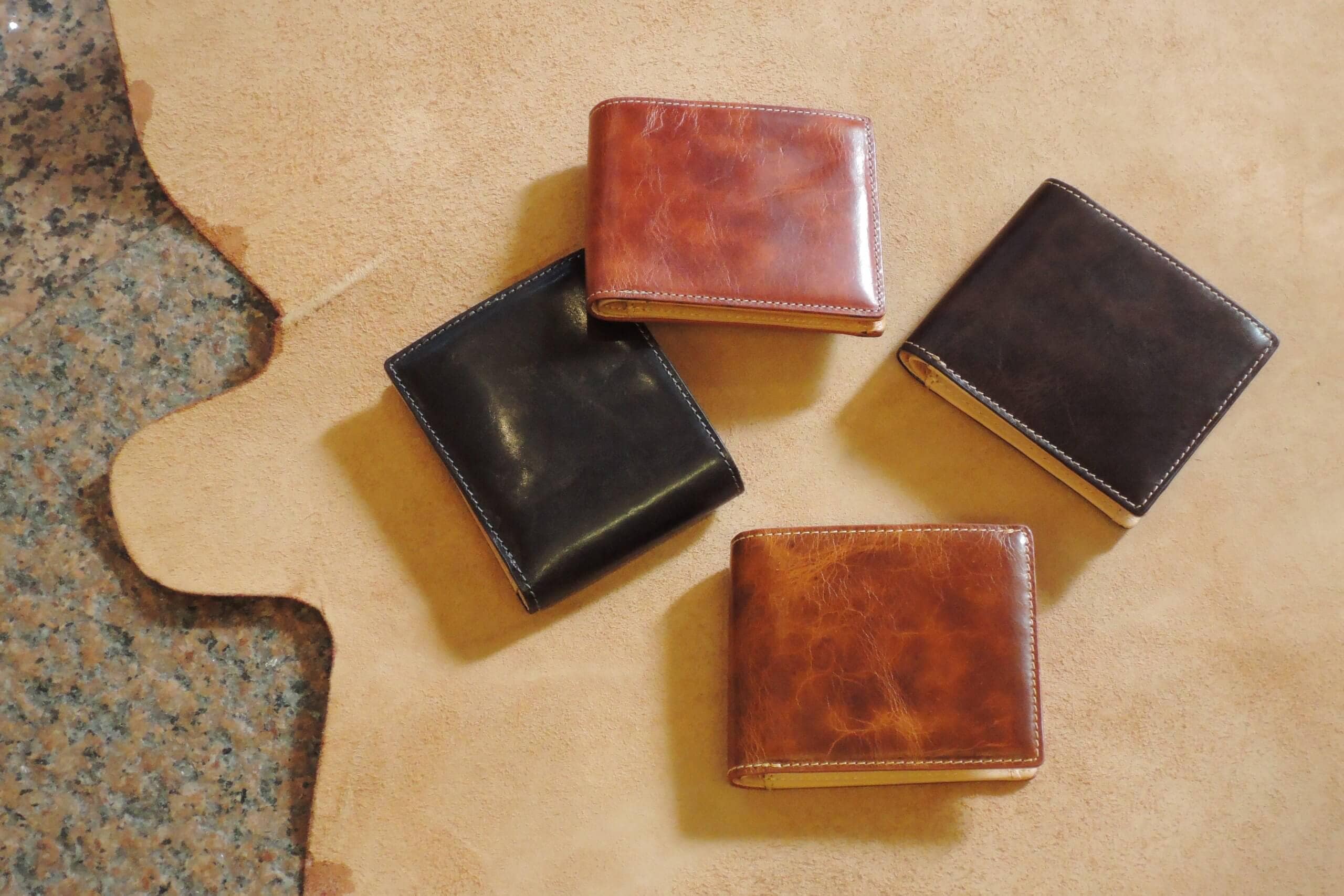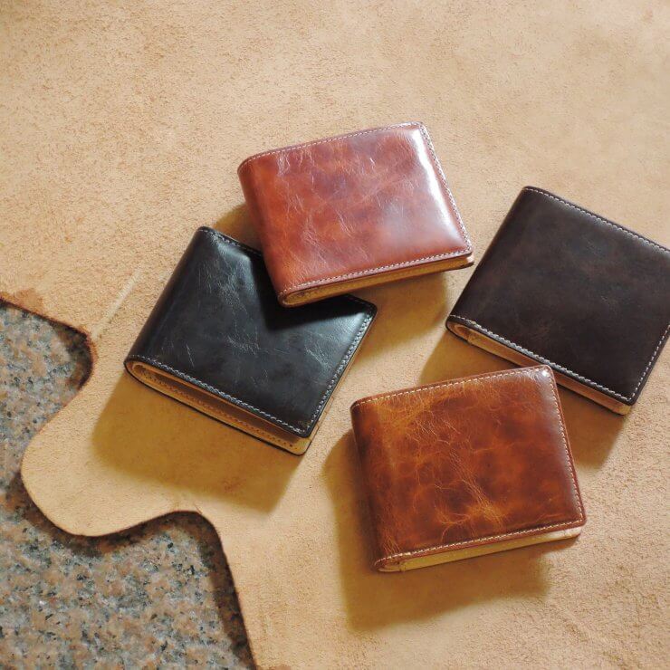 革を裁断する場所によってシワの入り方、色の濃淡が全て異なるため全て一点もの。