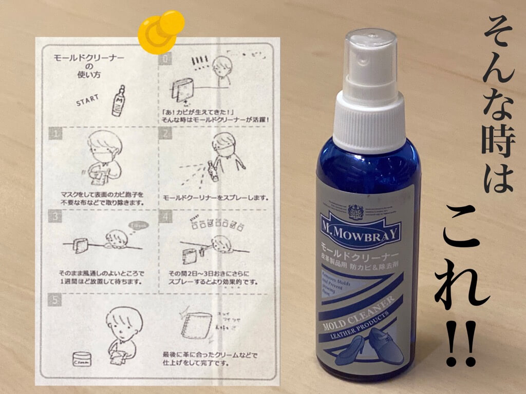 2.カビの生えた革製品とクリーナーを約40cmほど離してスプレーを塗布