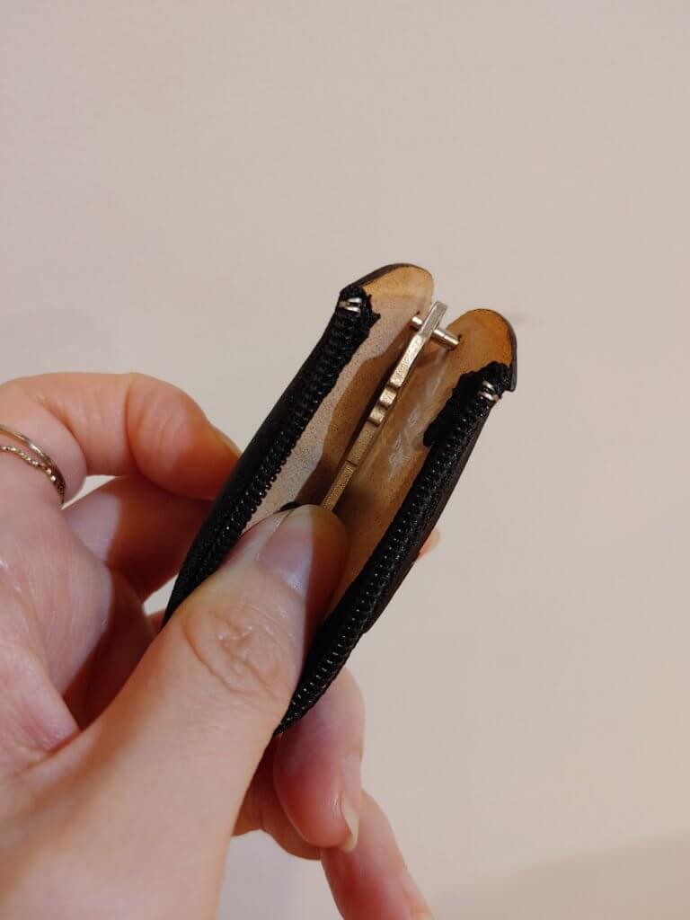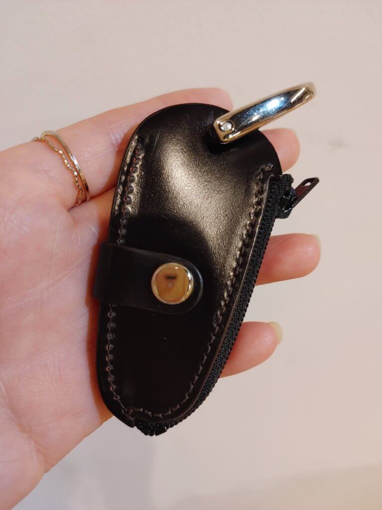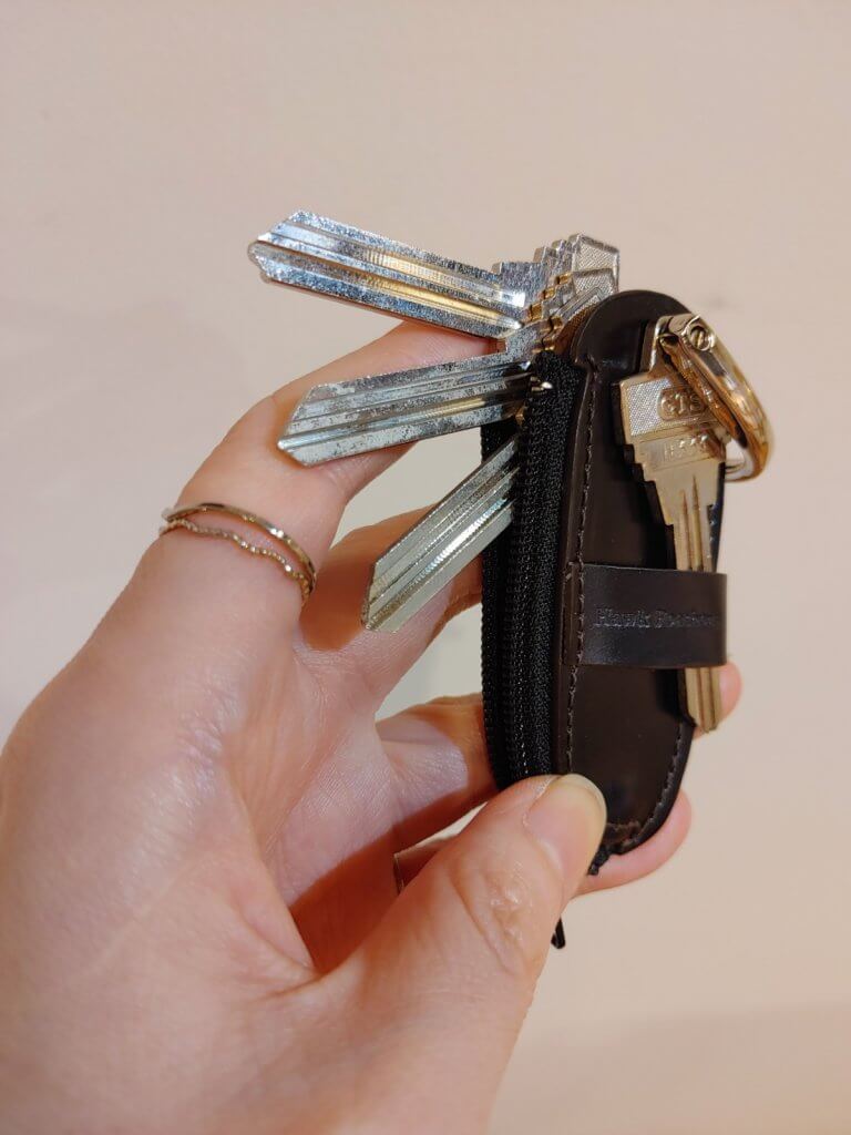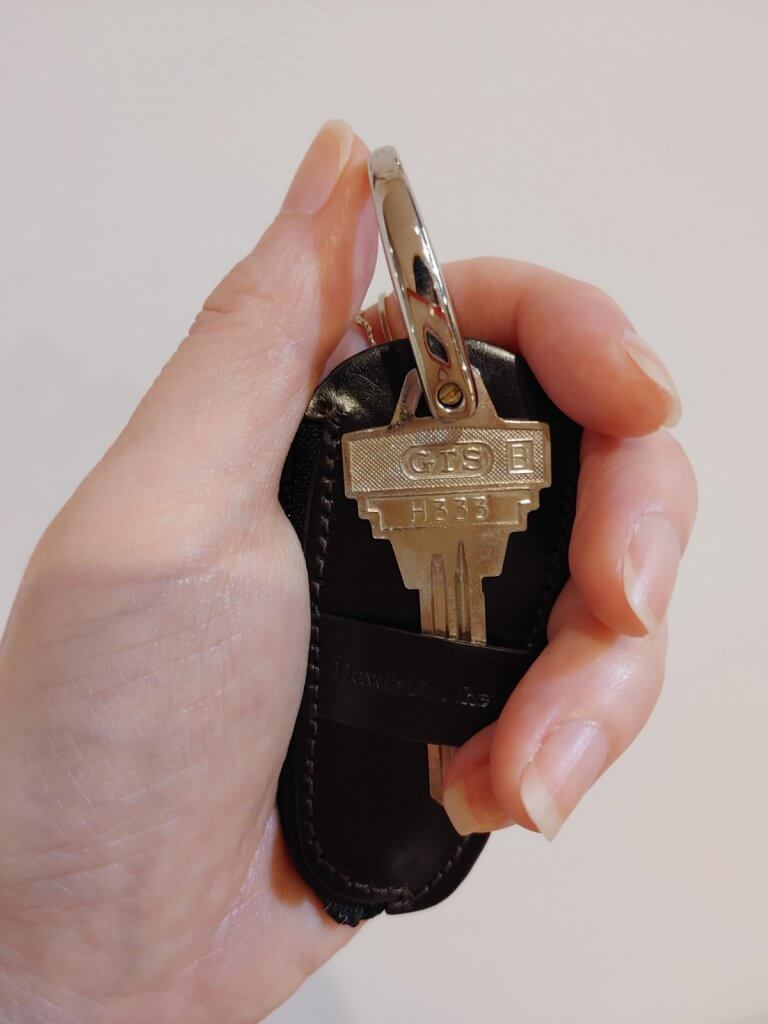 よく使う鍵は外側で、中には薄いタイプなら3本は収納可能な手のひらすっぽりなキーケース。