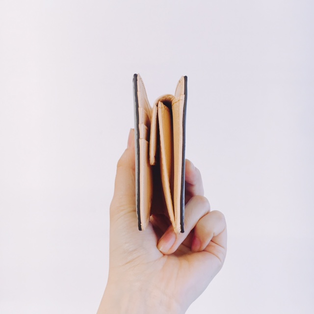 最初は革が硬いのでお金やカードを入れるとお財布が開いてしまうかもしれませんが、段々と馴染んできてそのうちペタンと閉じるようになります。