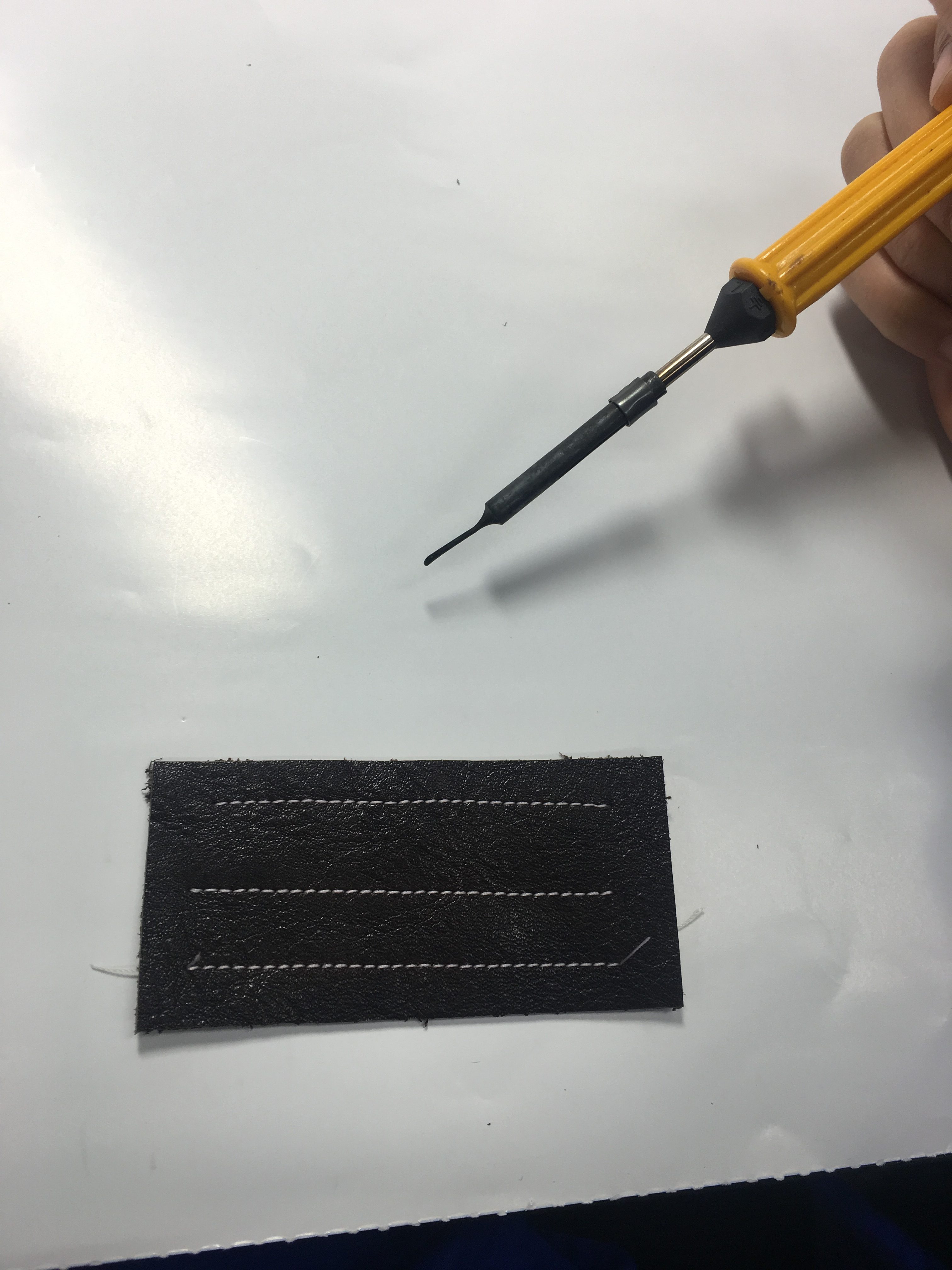 専用のコテで糸を短く焼き切ります。焼かれたところが玉になって糸止めになります。問題はプラスチックが焦げるようなニオイと、もし革に当たってしまうと焦げる可能性があるというところです。