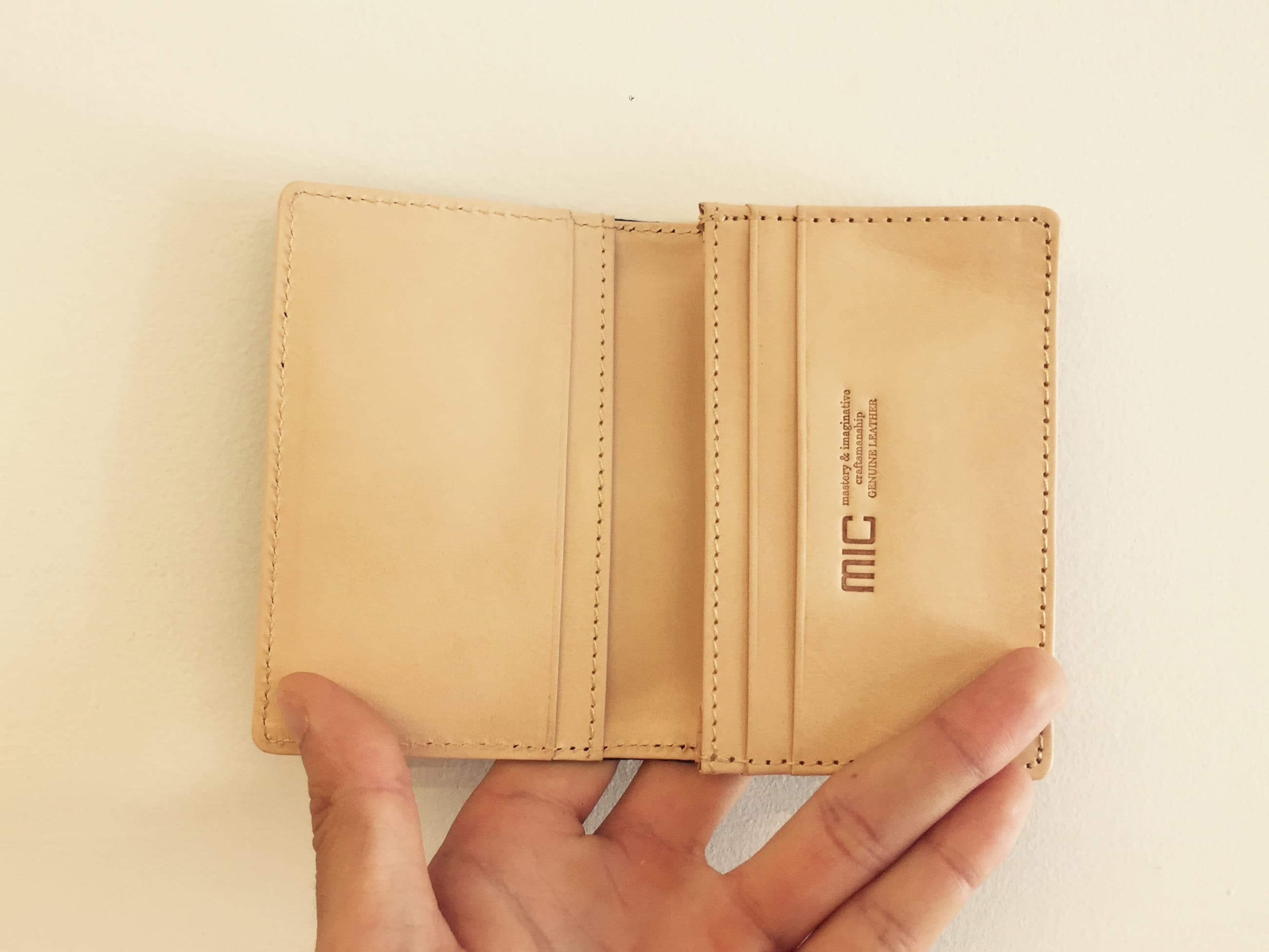 革の表面に蝋をたっぷりと塗ったmicのブライドルレザー。