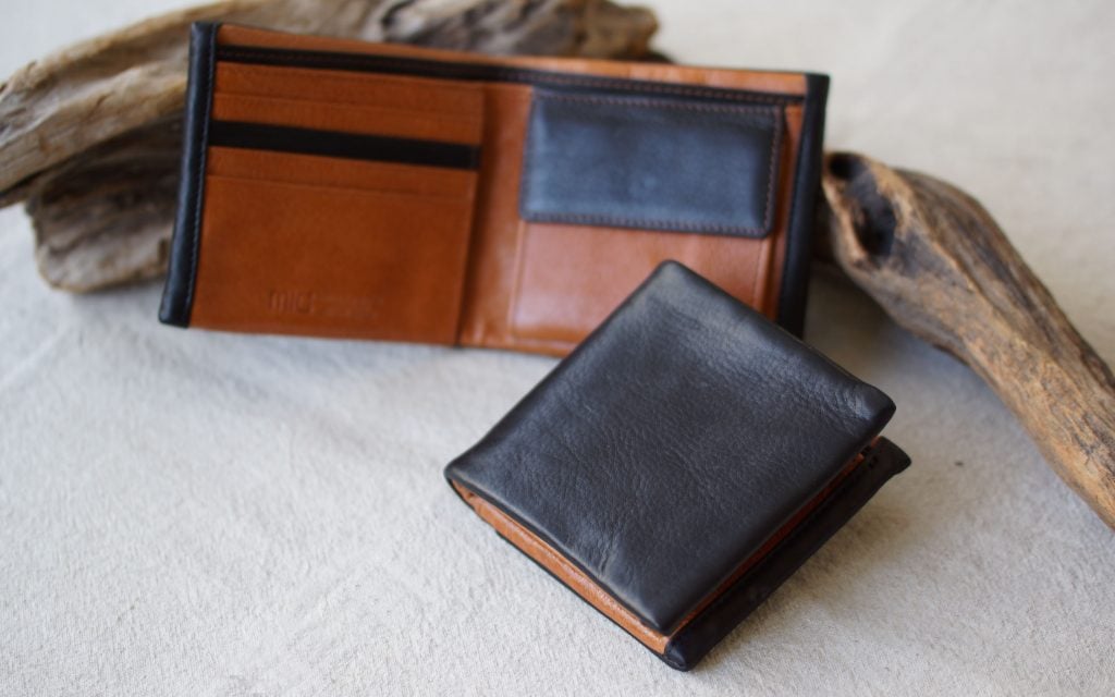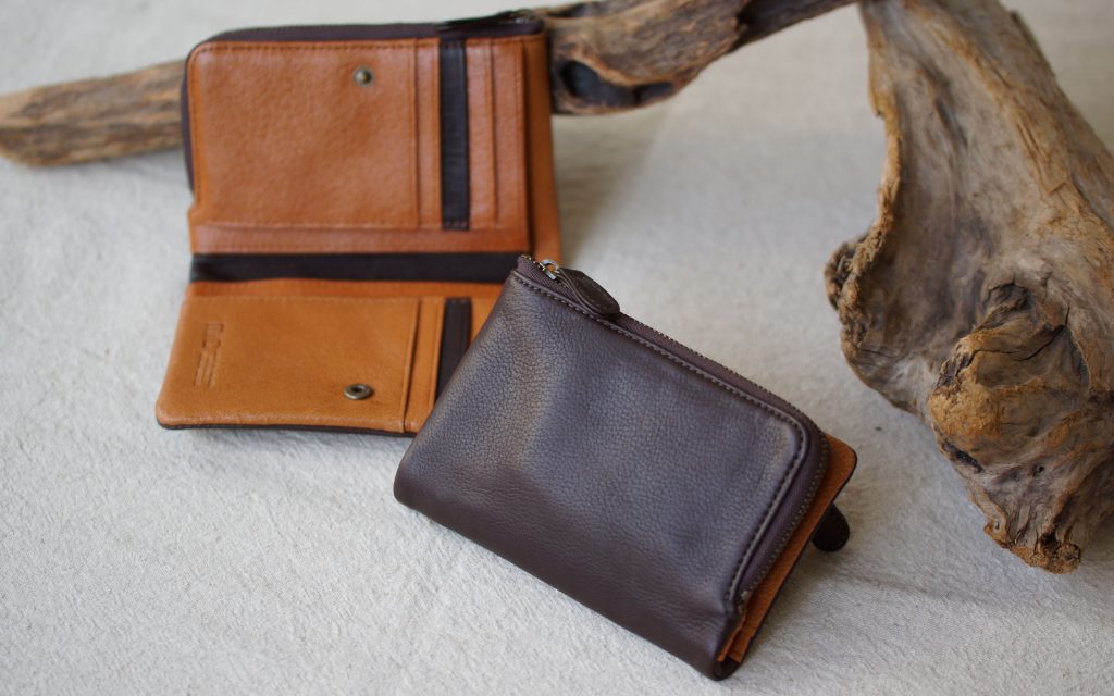 色はブラック、ブラウンの2色で、中は共通のキャメル色の豚革を使用し、表と内革でコンビ色で目にも楽しいお財布になっています。