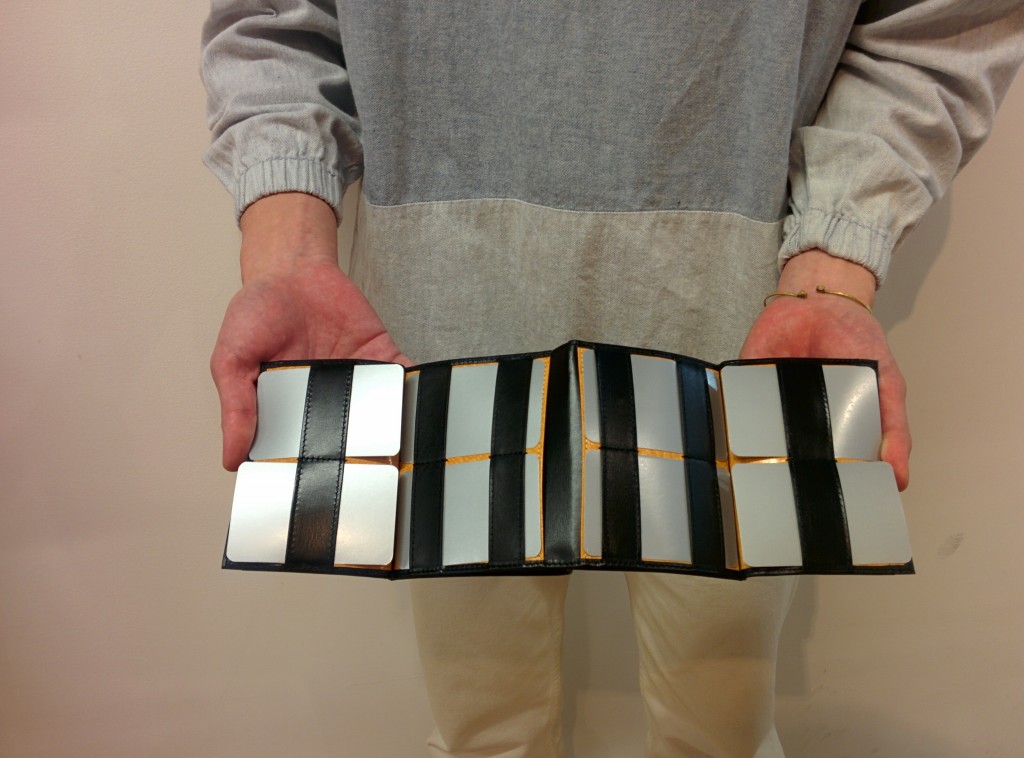 折った状態だと、向かいのベルトと互い違いになることで、薄さを最大限まで追及しています。