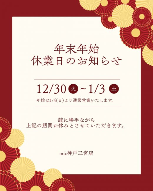 2025年12月29日2025年12月29日 mic ショップスタッフ用アカウント神戸店・店舗&地域情報年末年始の営業時間のお知らせ【神戸三宮店】こんにちは ☺ いつもMIC神戸三宮店にお越しいただきあ続きを読む